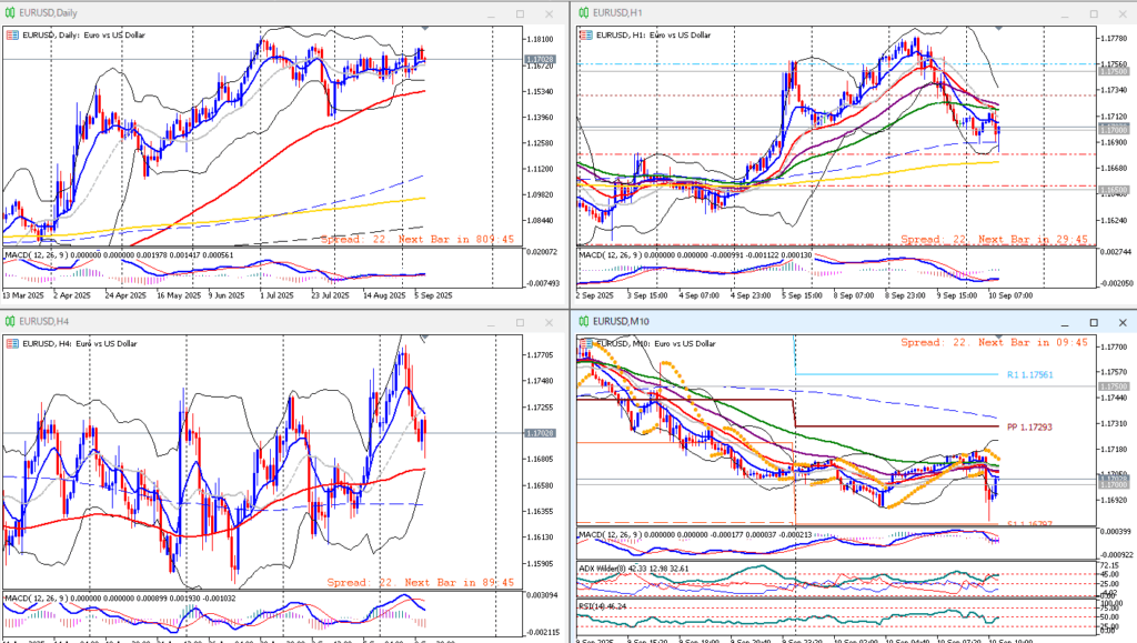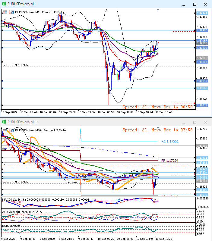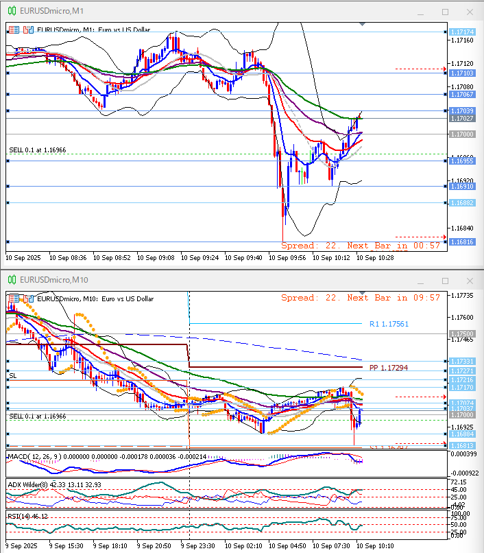 上下下。1時間足、ダウが崩れて安値割れ、パーフェクトオーダーではない、EMA10に角度あり、キリ番付近。10分足パーフェクトオーダーが完成したところ、ヒゲで戻されている。本日ピボットラインに到達していない。