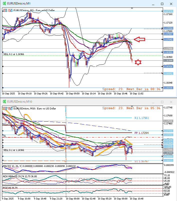 損切り後、1分足EMA10がEMA75を上抜け、ローソク足がしばらくEMA10付近でユラユラ、安値を下抜けて、EMA10以下になって←で再売りエントリー。決済は☆、10分足-2σタッチ。