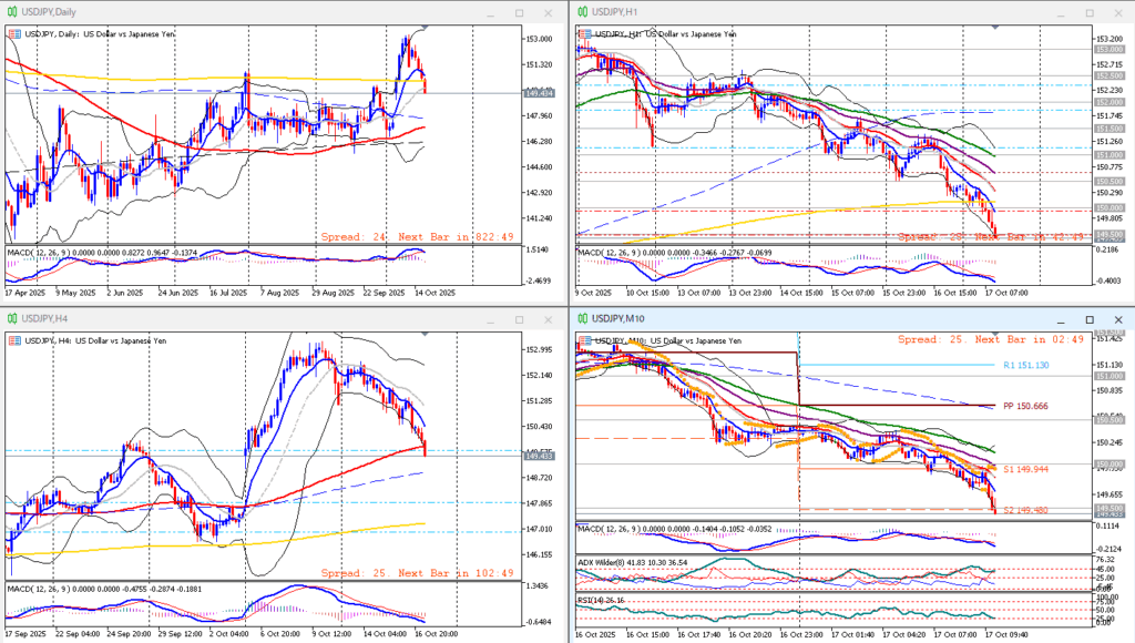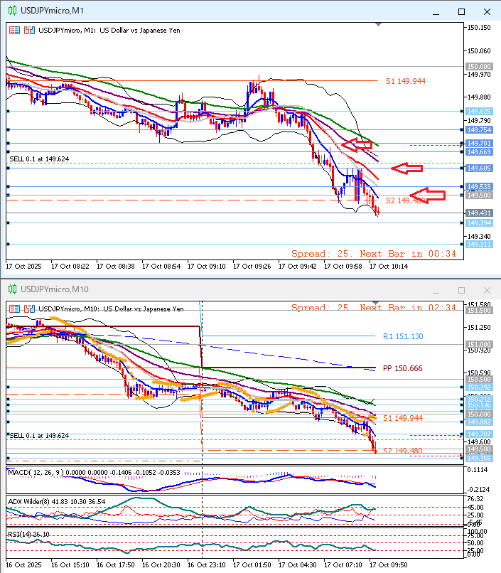 【USDJPY】強い下落1分足EMA10タッチでスキャル スキャルピングFX 2025.10.17 下下下。1時間足パーフェクトオーダー、10分足パーフェクトオーダー。大きく下落している場面、週末要因もあり、窓埋めも考慮。 1分足←付近、EMA10タッチで何度も数pips抜くスキャルを実行。勢いがあるがいつもで続くかわからないので、恐る恐るエントリー、エグジットを繰り返す。