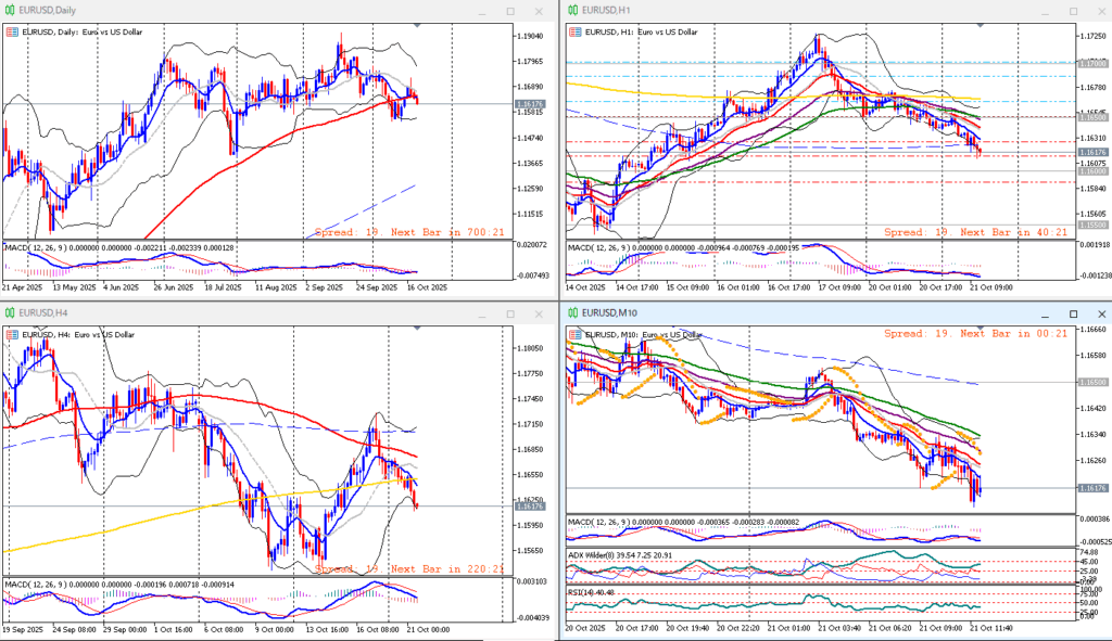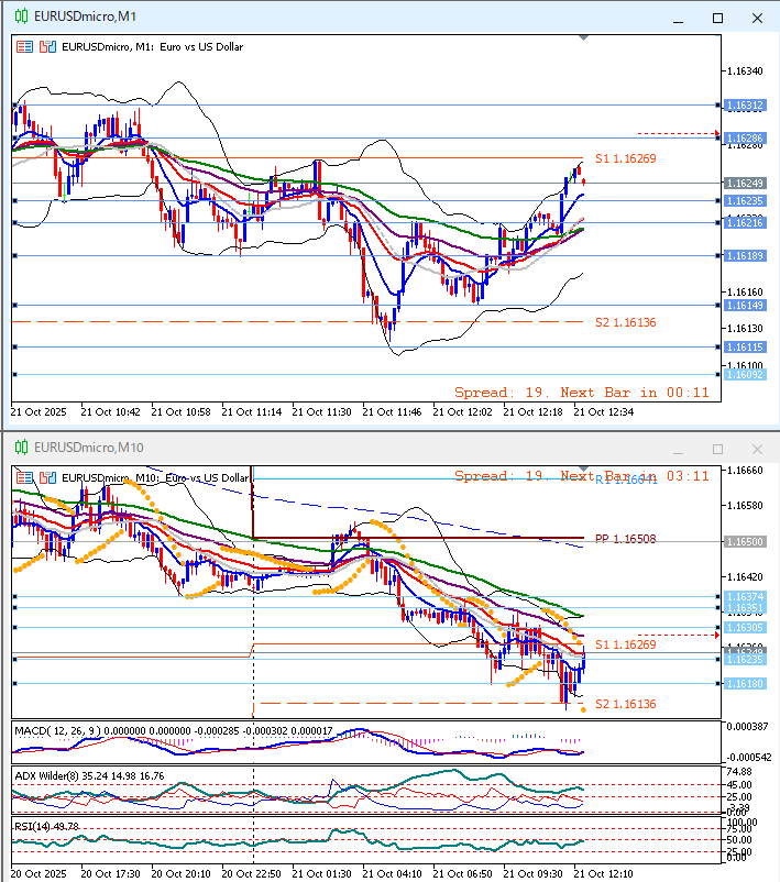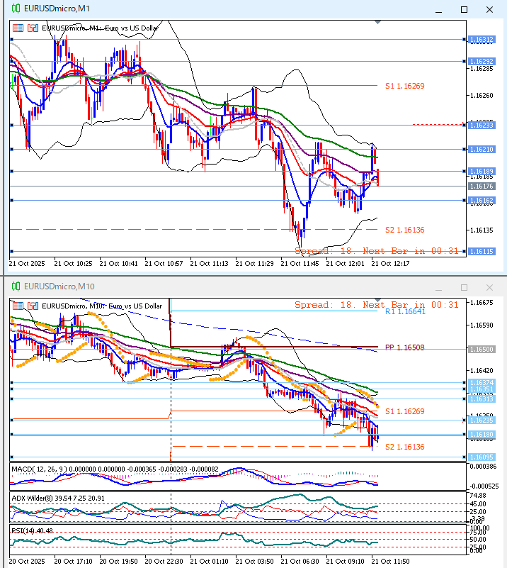 【EURUSD】見送るべき場面で我慢できず天罰下る スキャルピングFX 2025.10.21 下下下。1時間足パーフェクトオーダーもサポート付近。10分足パーフェクトオーダーもすでに-2σタッチMACD不都合な状態 1分足EMA75、-2σタッチで売れず、遅れて売りエントリー。見送るべき場面。 10分足EMA25抜けで損切り。見送るべき場面で我慢できず、数pips取ろうとして天罰が下る。