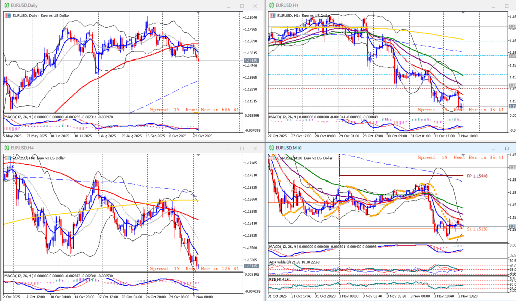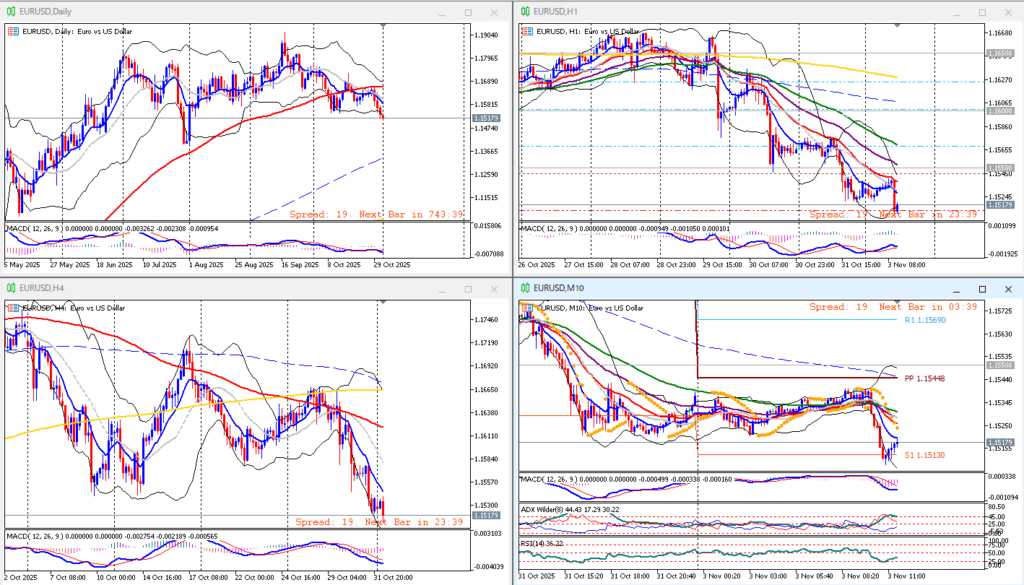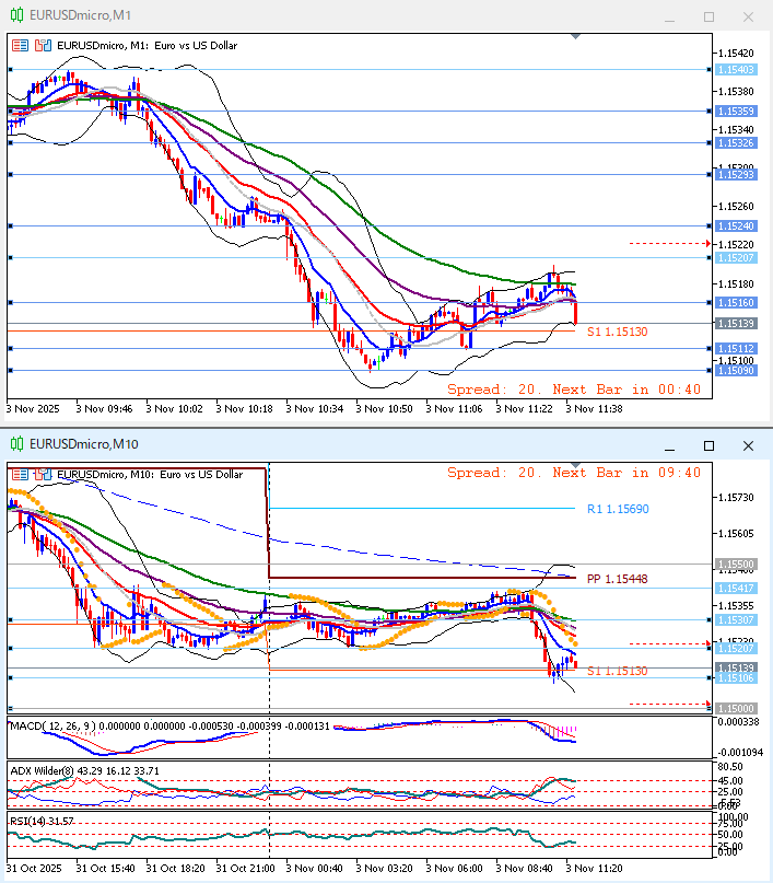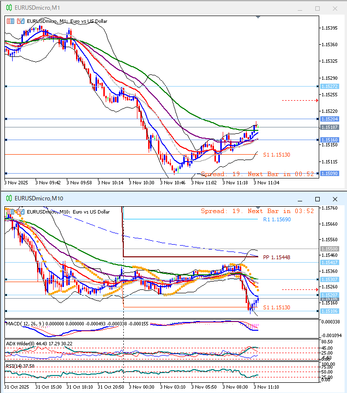 1分足-2σタッチで決済。10分足の形だとまだ下がりそうだが、1.15000のキリ番付近なので欲張らず決済。