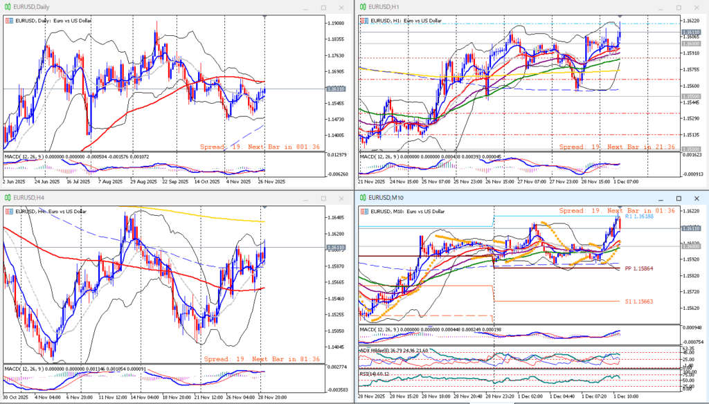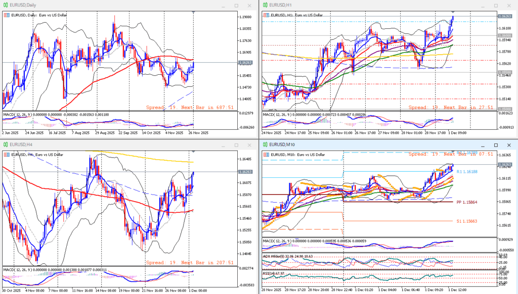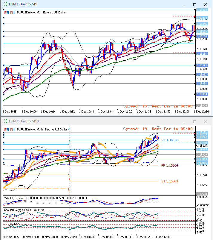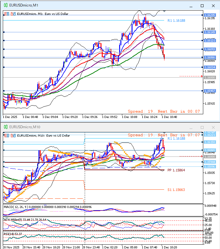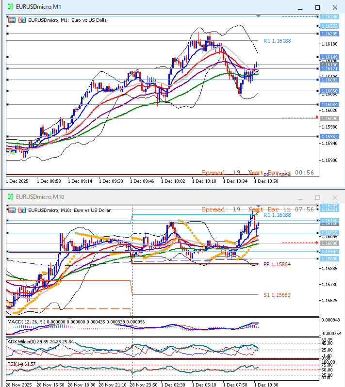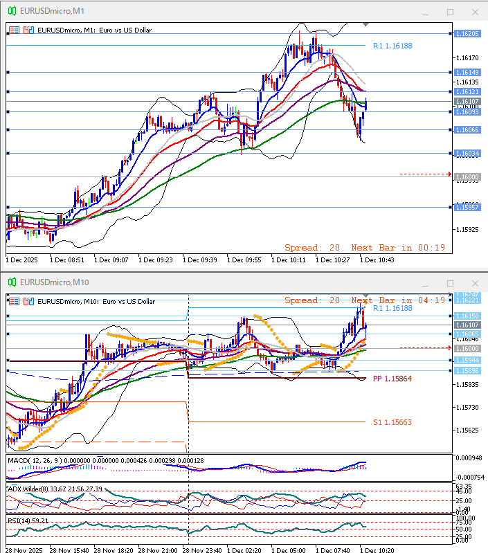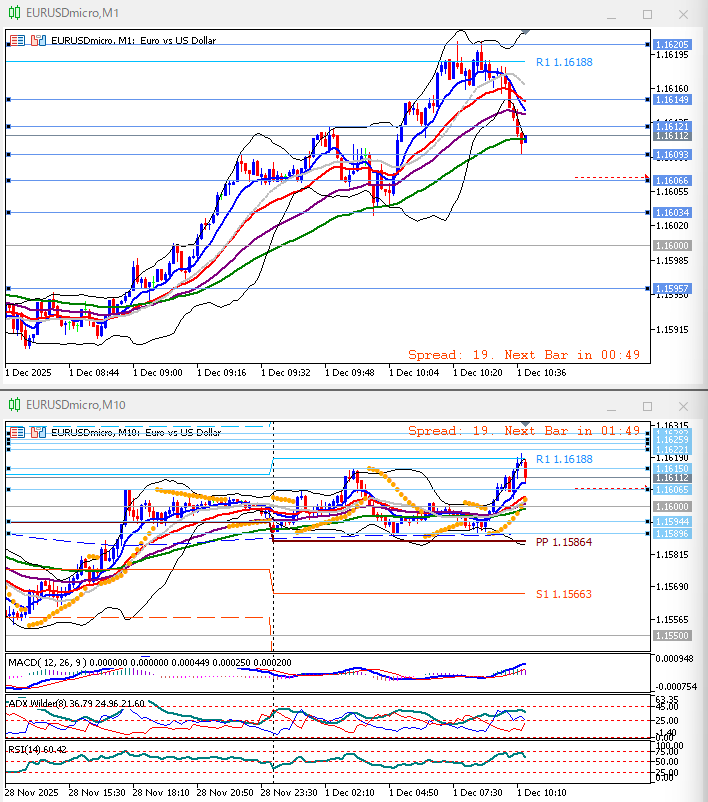 上上上。1時間足パーフェクトオーダー、高値更新も+2σ跳ね返されてヒゲ。10分足パーフェクトオーダー、EMA10並行、MACD並行。