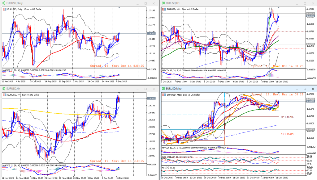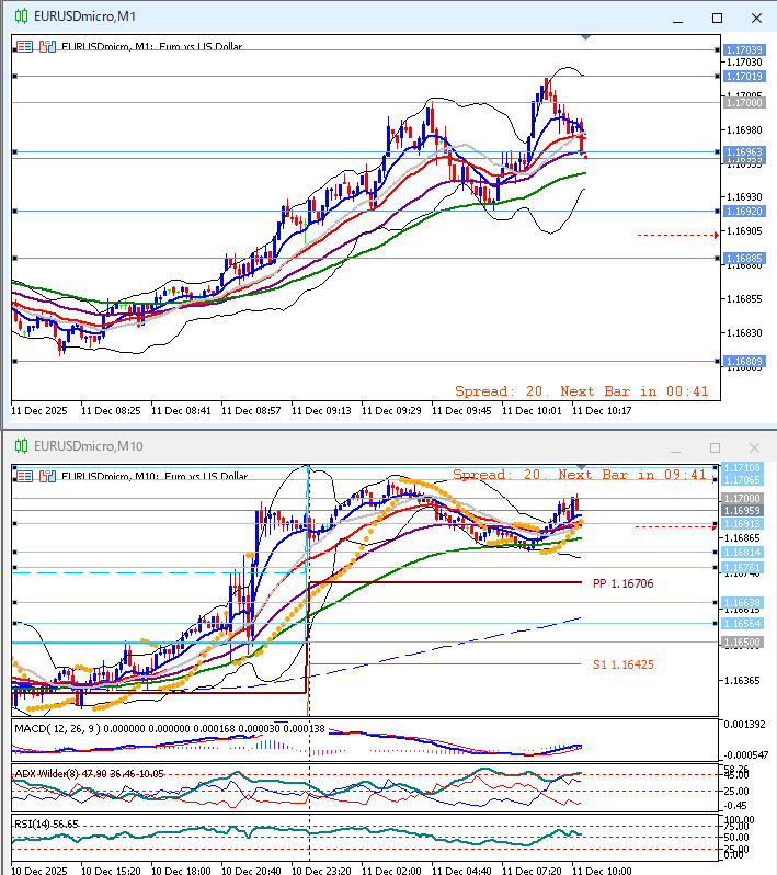 【EURUSD】遅れてエントリー数pips抜き スキャルピングFX 2025.12.11 上上上。1時間足急騰パーフェクトオーダー、10分足キリ番でレンジ気味、パーフェクトオーダー形成中。 1分足EMA75タッチで入れず、遅れて飛びつき買いエントリー。数pips取ってミドルバンドで決済。 その後、 1分足、10分足+2σ到達。