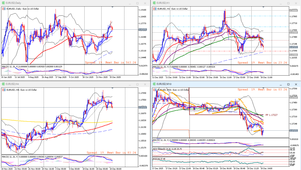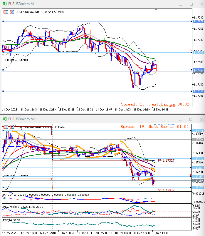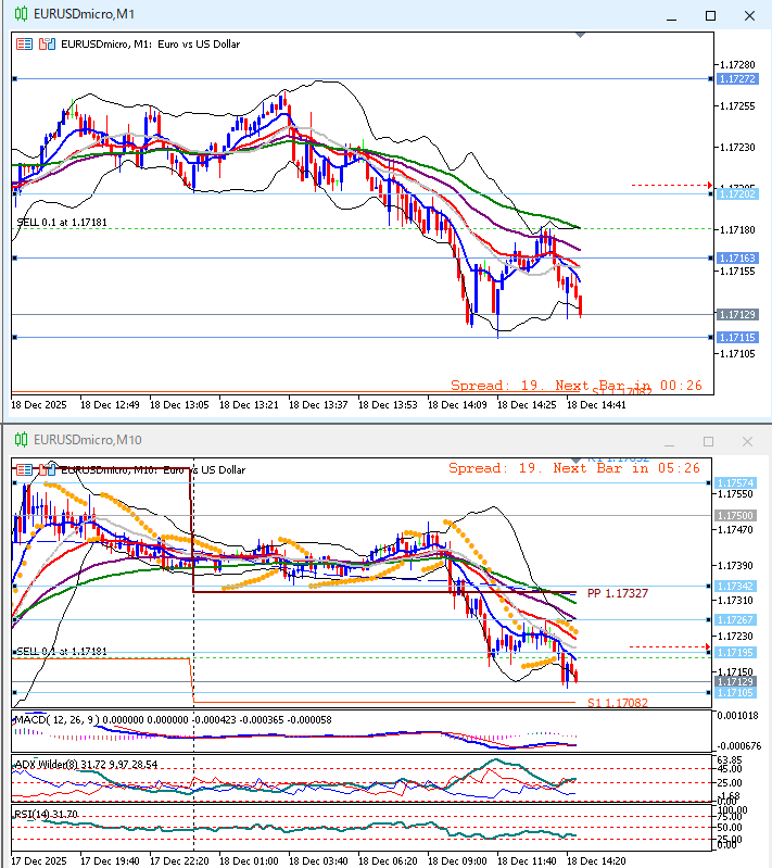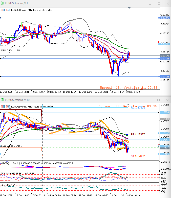 【EURUSD】指標発表前のスキャル スキャルピングFX 2025.12.18 上下下。1時間足パーフェクトオーダー形成中、-2σ到達、ヒゲ現出。10分足パーフェクトオーダー、-2σで反発 1分足EMA45、+2σタッチで売りエントリー。損切りはEMA75。 指標発表前なのでミドルバンドで決済。数pips抜くスキャル。 その後、 -2σ到達。