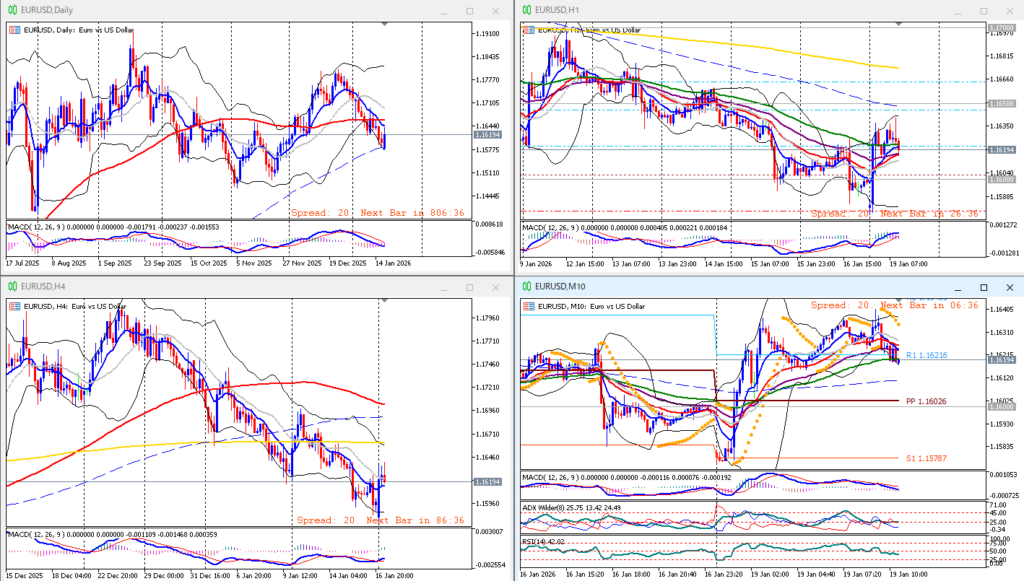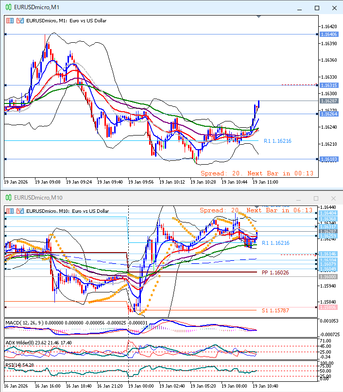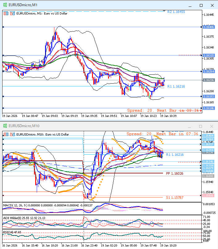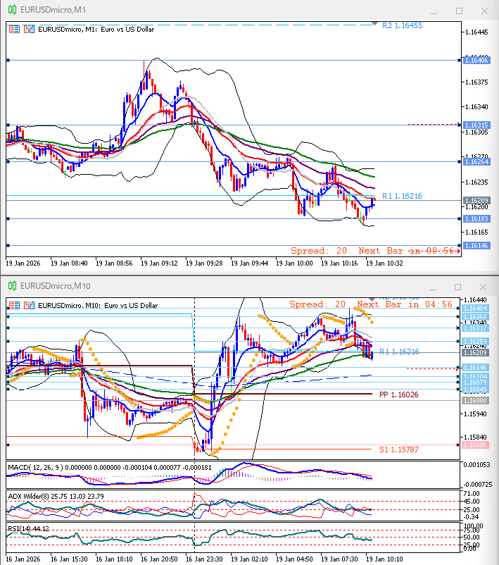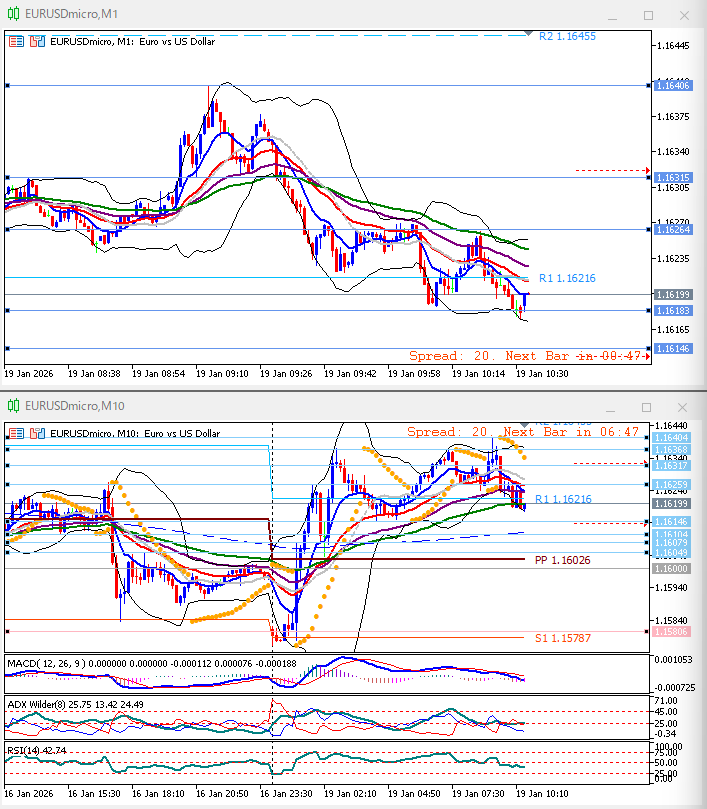 下上上。1時間足方向感なし。10分足パーフェクトオーダー崩れEMA10がEMA45をデッドクロス。ボリンジャーバンド平行気味だがミドルバンド下向きで、これも方向感なし。