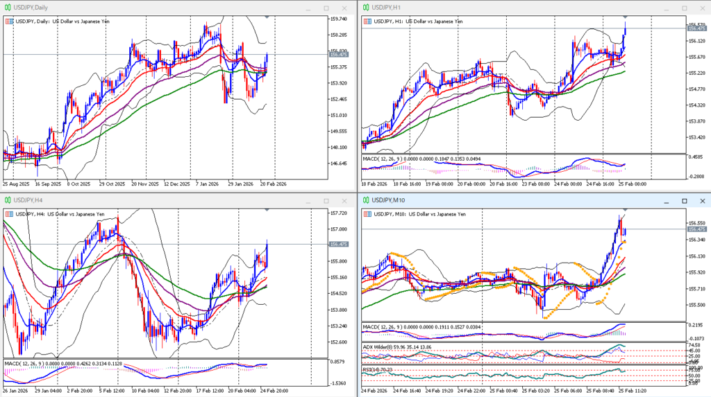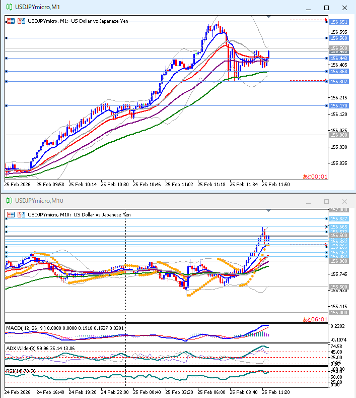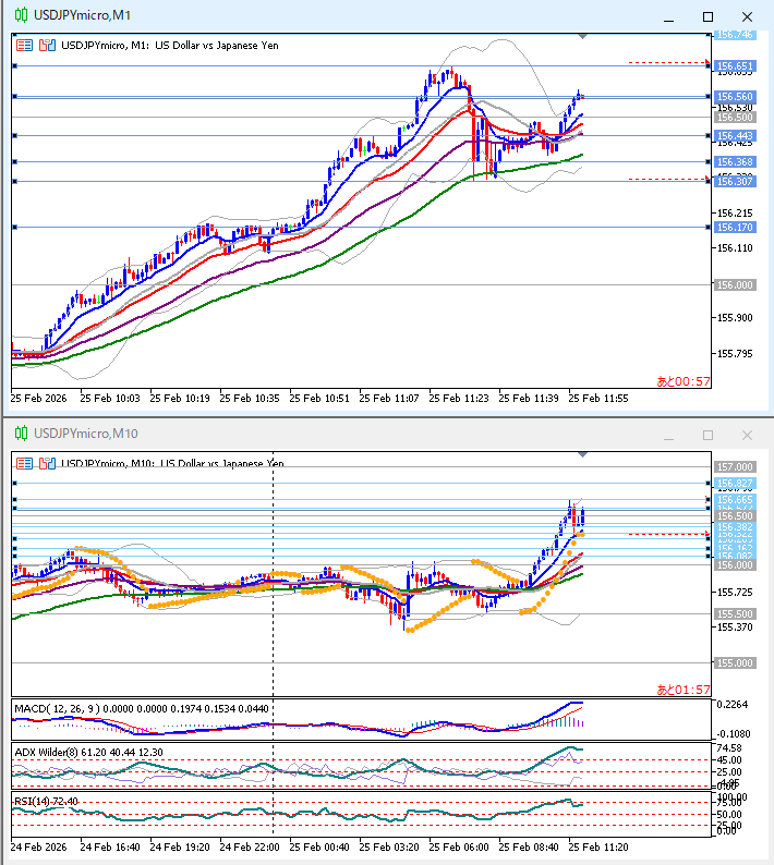 上上上。1時間足パーフェクトオーダー、急騰、+2σ突き抜け、上ヒゲ陰線、見送るべき場面。10分足パーフェクトオーダー、+2σに跳ね返されて、EMA10にファーストタッチ。