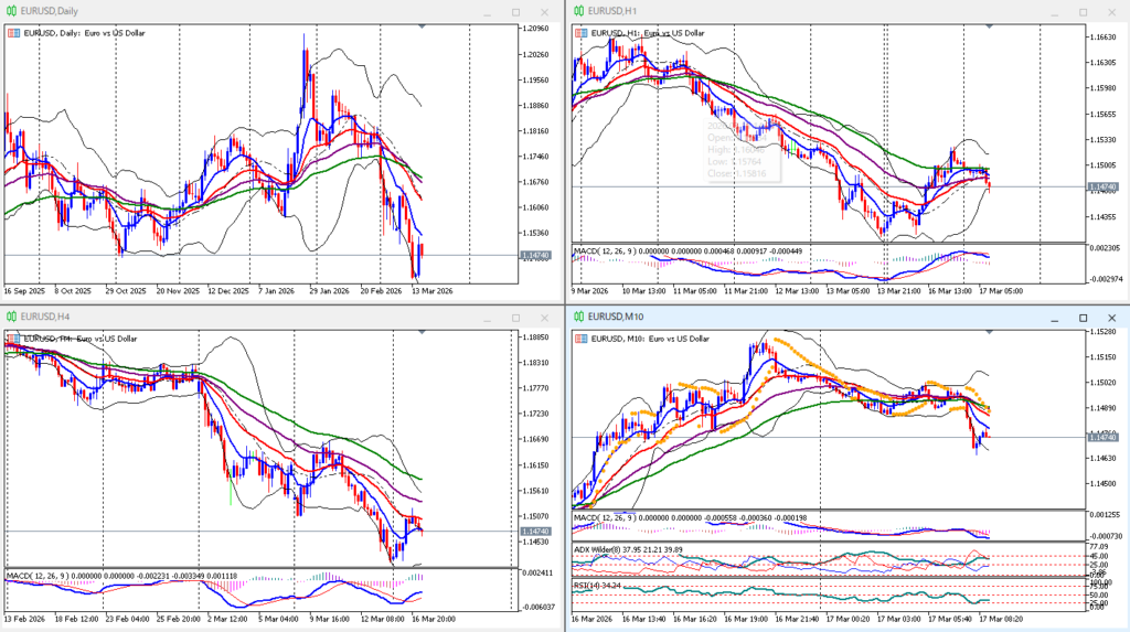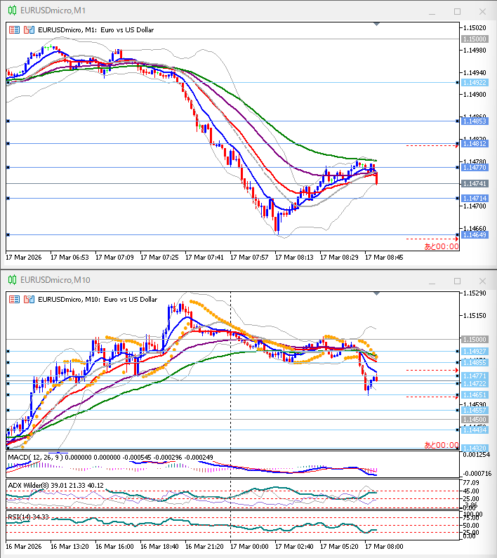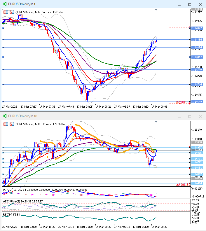下下下。1時間足EMA25以下、-2σ到達、上位足では戻り目、1時間足では押し目にも見える。10分足パーフェクトオーダー、EMA10角度あるがMACD平行気味。