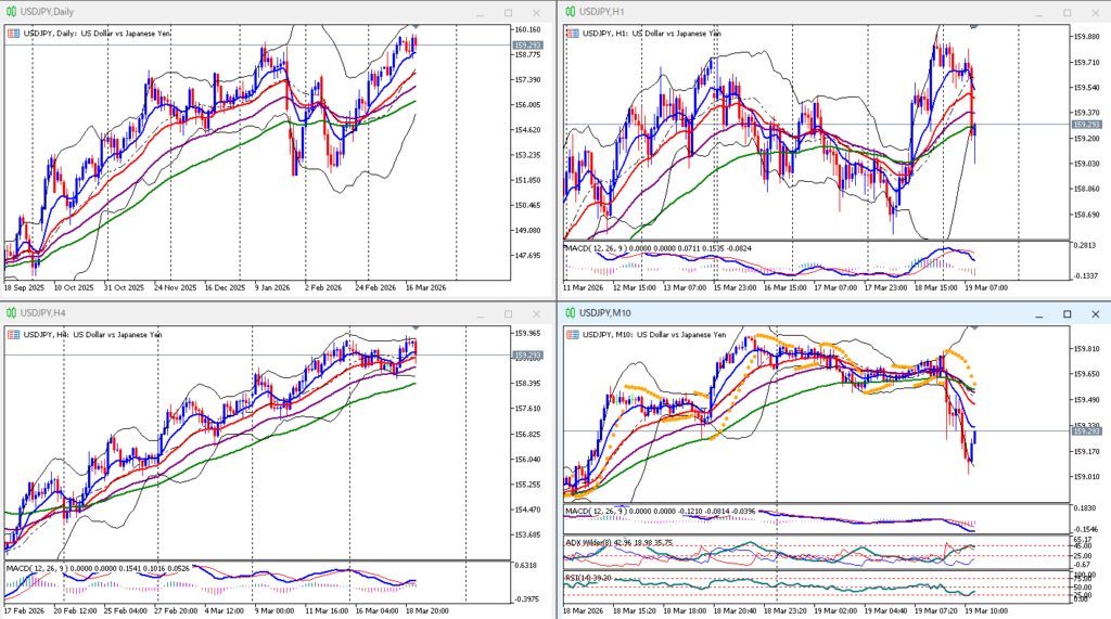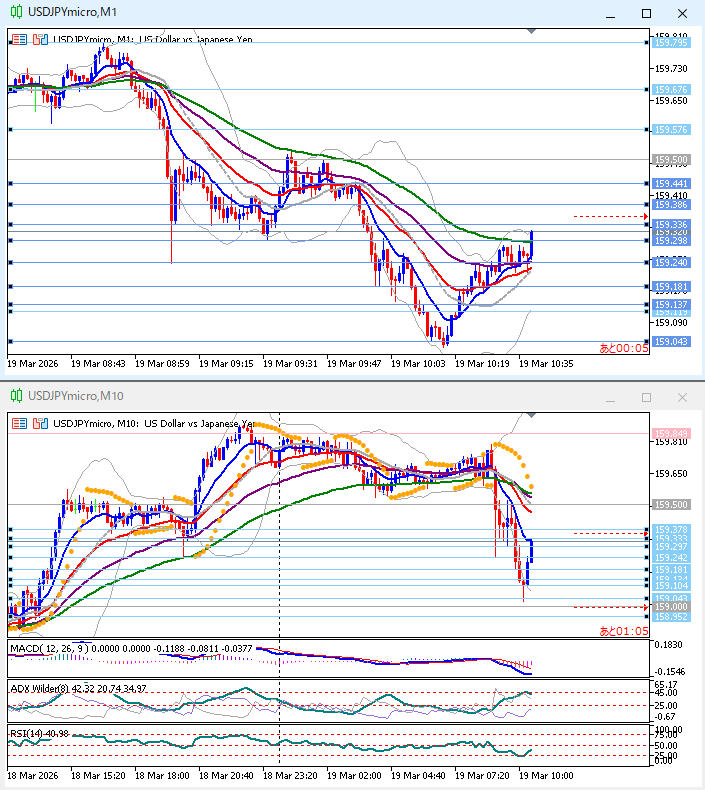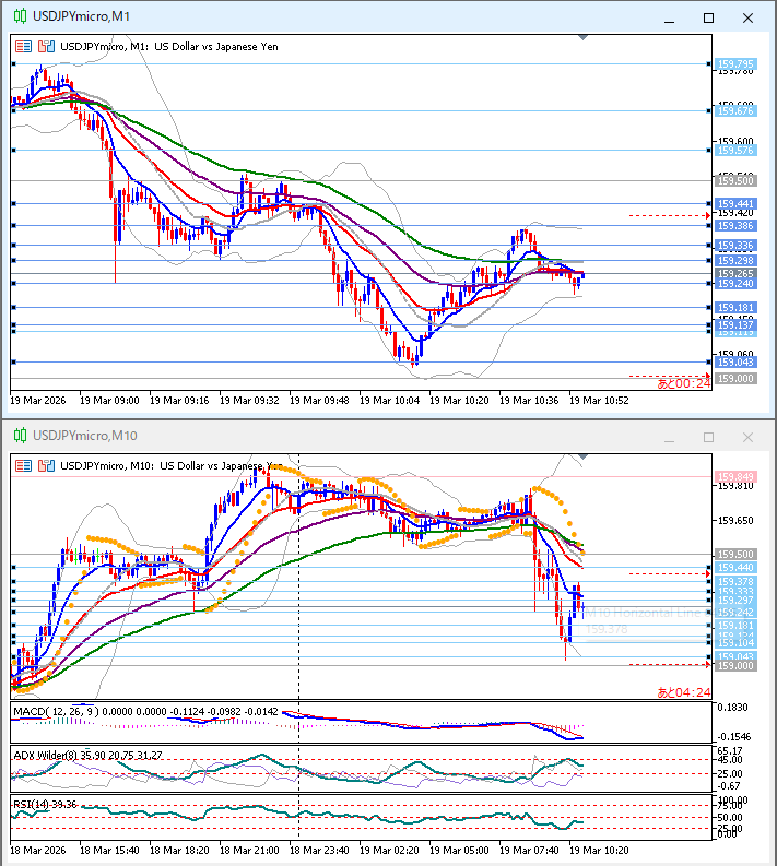 【USDJPY】10分足EMA10角度ありも見送った場面 スキャルピングFX 2026.03.19 上下下。1時間足上向きパーフェクトオーダー、ニュースで下落大陰線からの戻り目、10分足パーフェクトオーダーEMA10角度あり、MACD並行。 1分足EMA75で売りエントリーポイントだが、1時間足の状態を見て見送り。 その後、 エントリーしていれば1分足の決済ポイントまで取れていたが、すんなり下げてくれないし、保有している時間が長くてストレス。1時間足の状態を見ればどっちにいってもおかしくない。